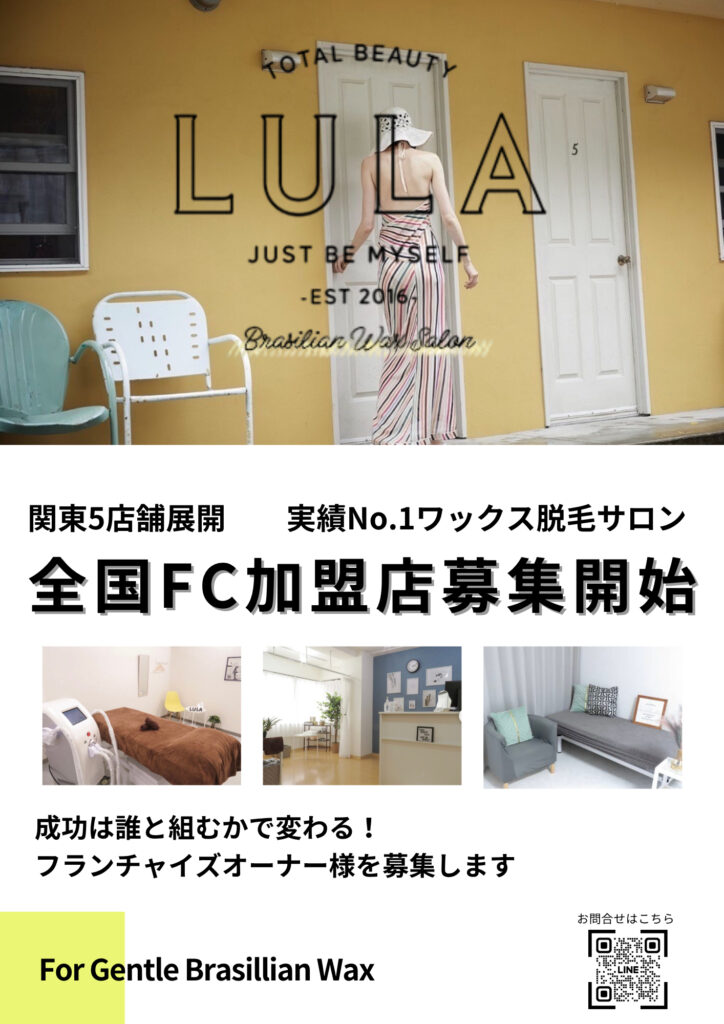 カインドワックスをプロデュースするワックス脱毛サロンLulaがフランチャイズオーナー様を募集致します。お問い合わせはカインドワックス公式LINEまでお願いします。